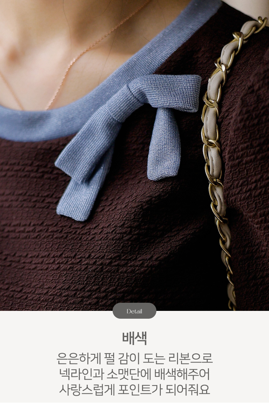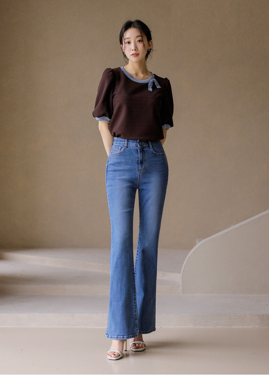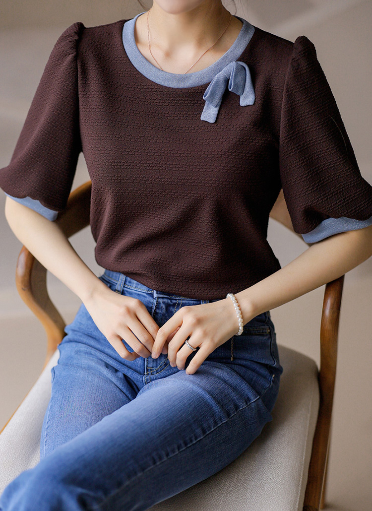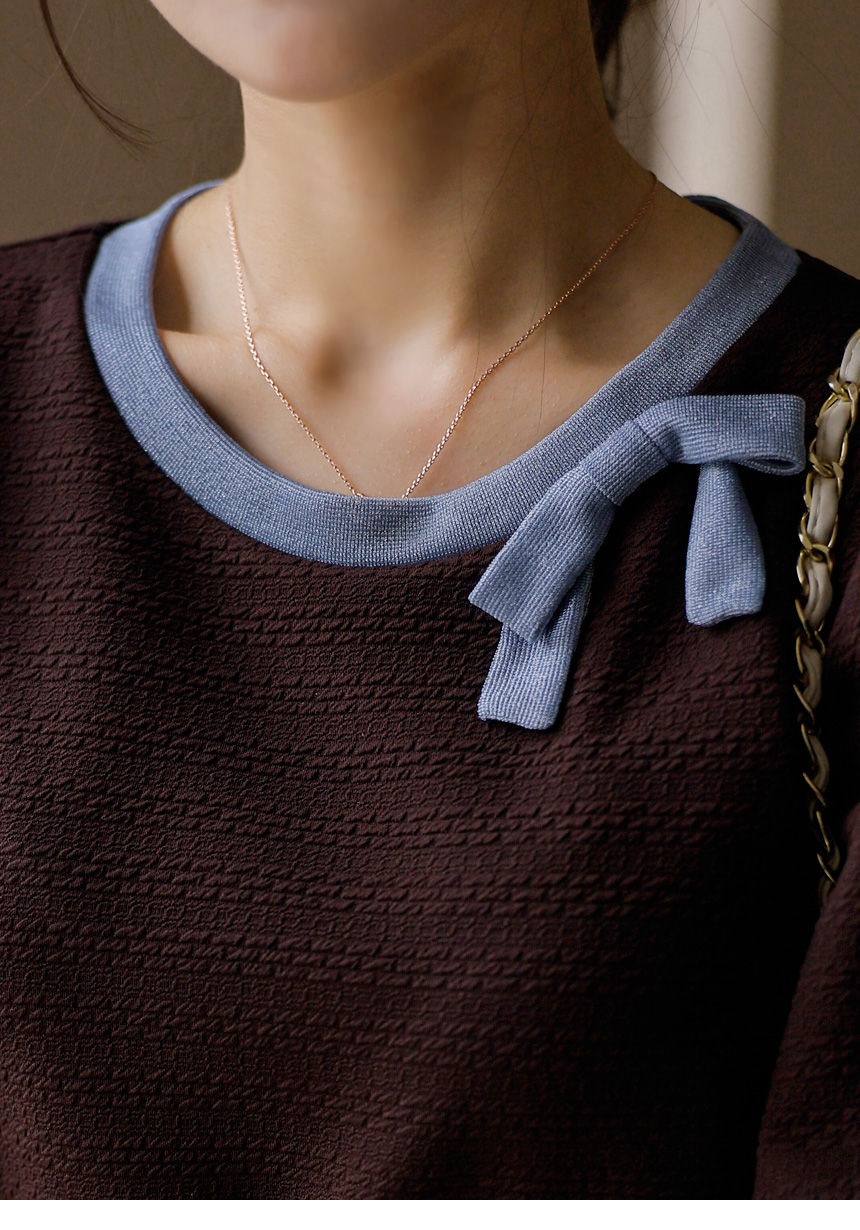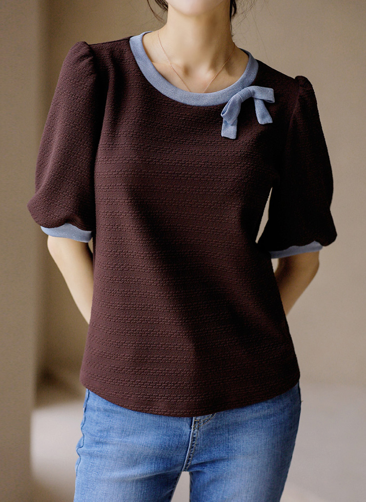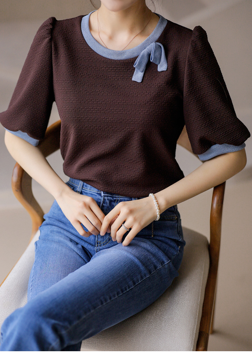 [LouisAngel] 펄 라인 리본 배색 쟈가드 퍼프 소매 블라우스 티