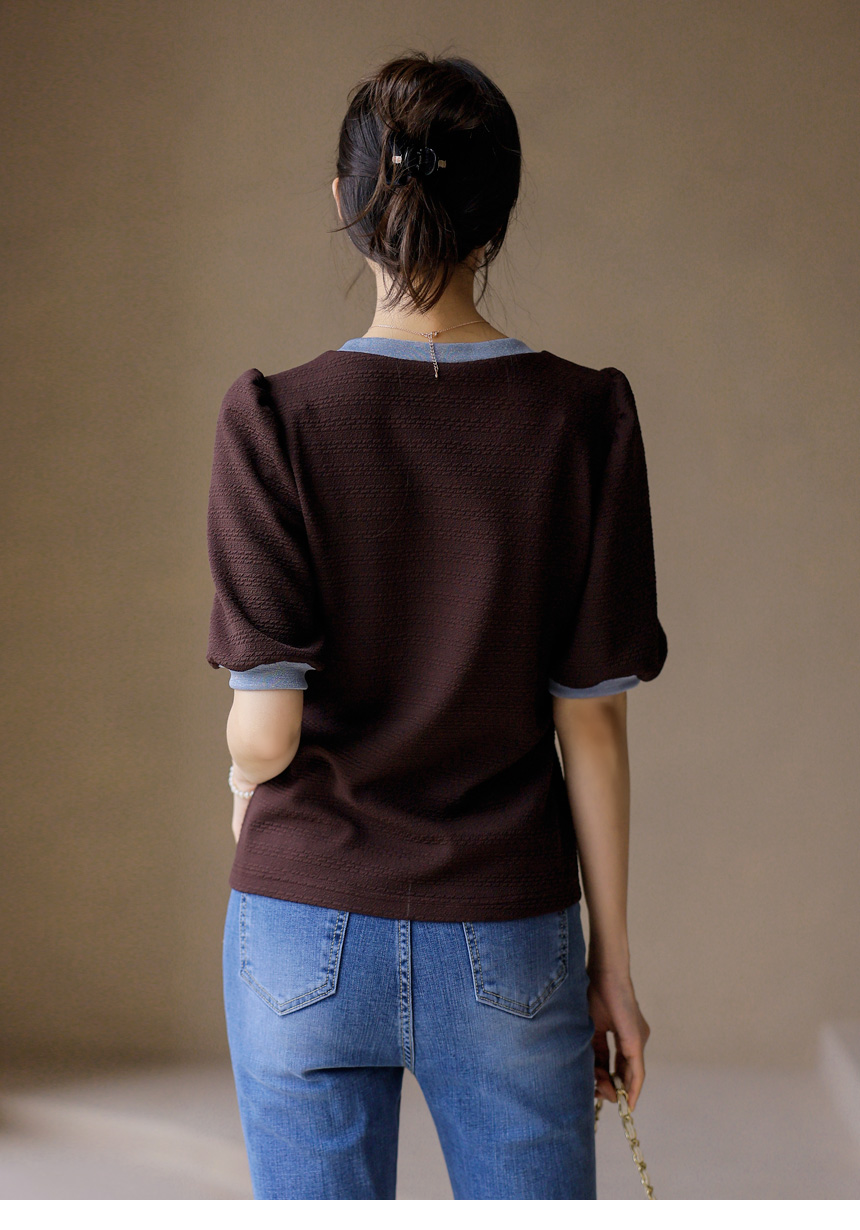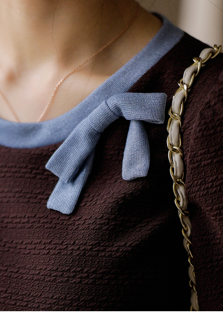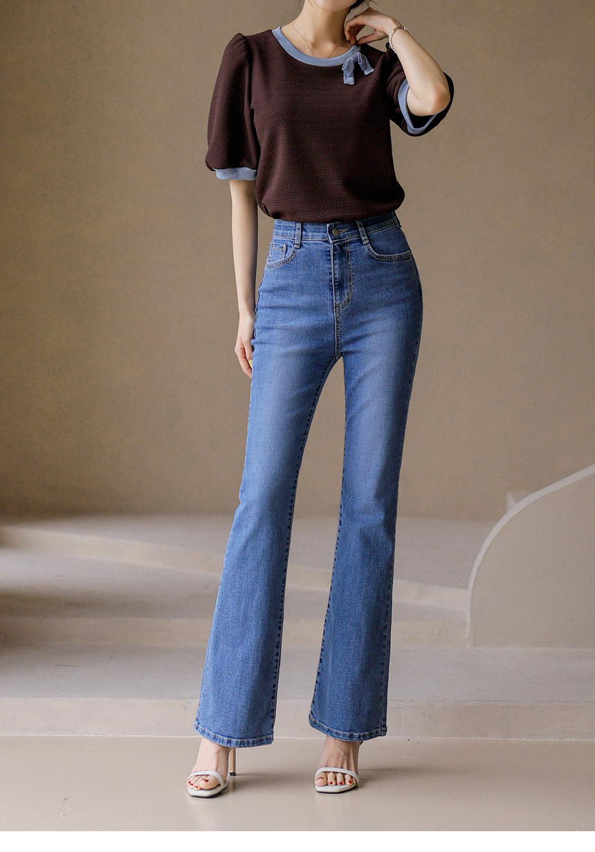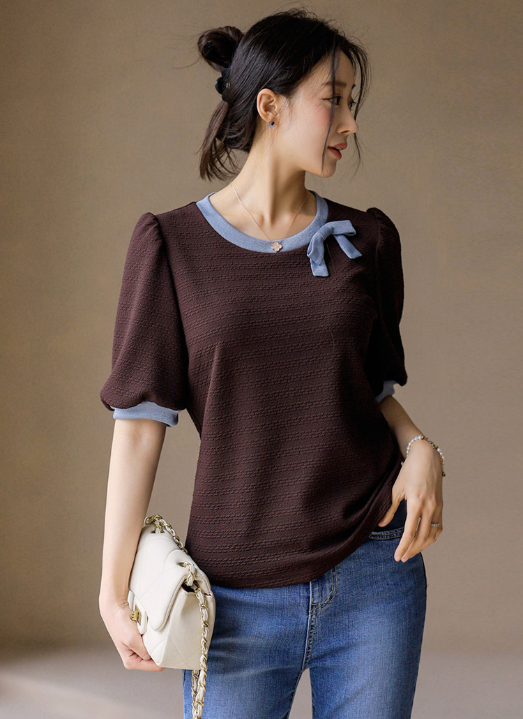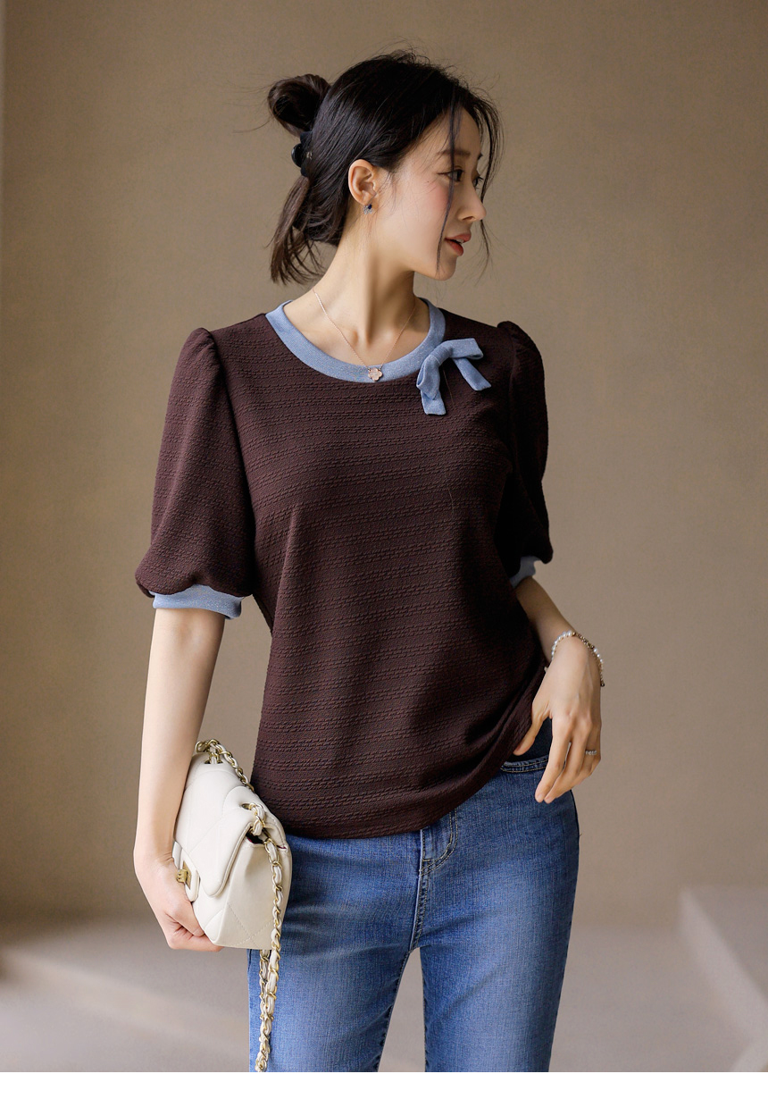 [LouisAngel] 펄 라인 리본 배색 쟈가드 퍼프 소매 블라우스 티