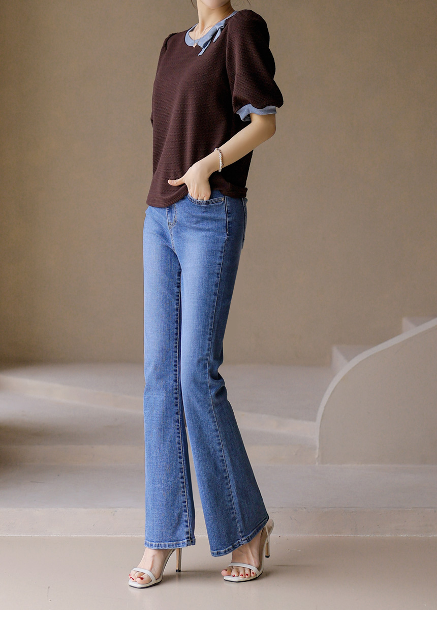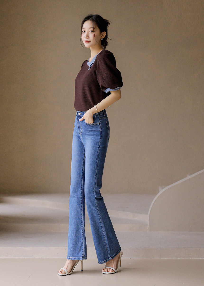 • Clean mid-wash denim with subtle stretch and hidden waistband offers all-day comfort, while a slim-to-bootcut silhouette elongates the legs with a polished finish.