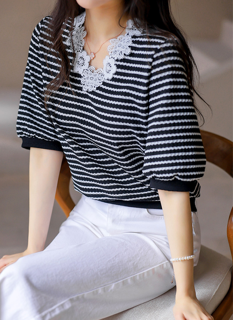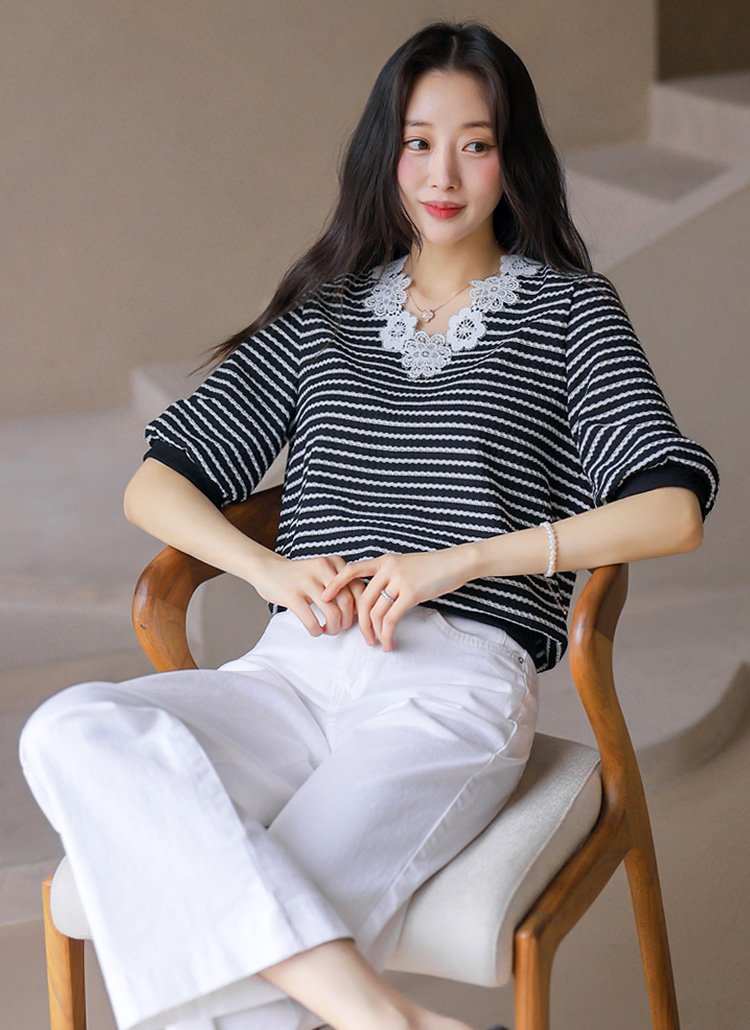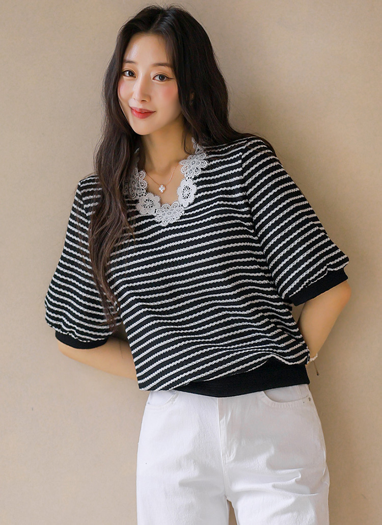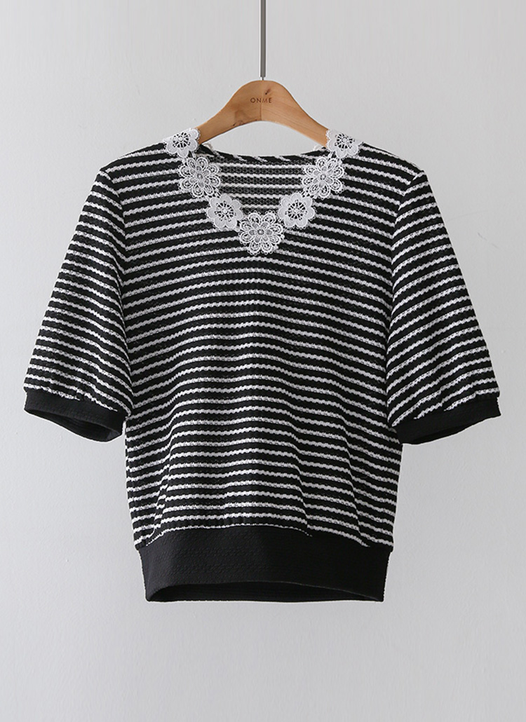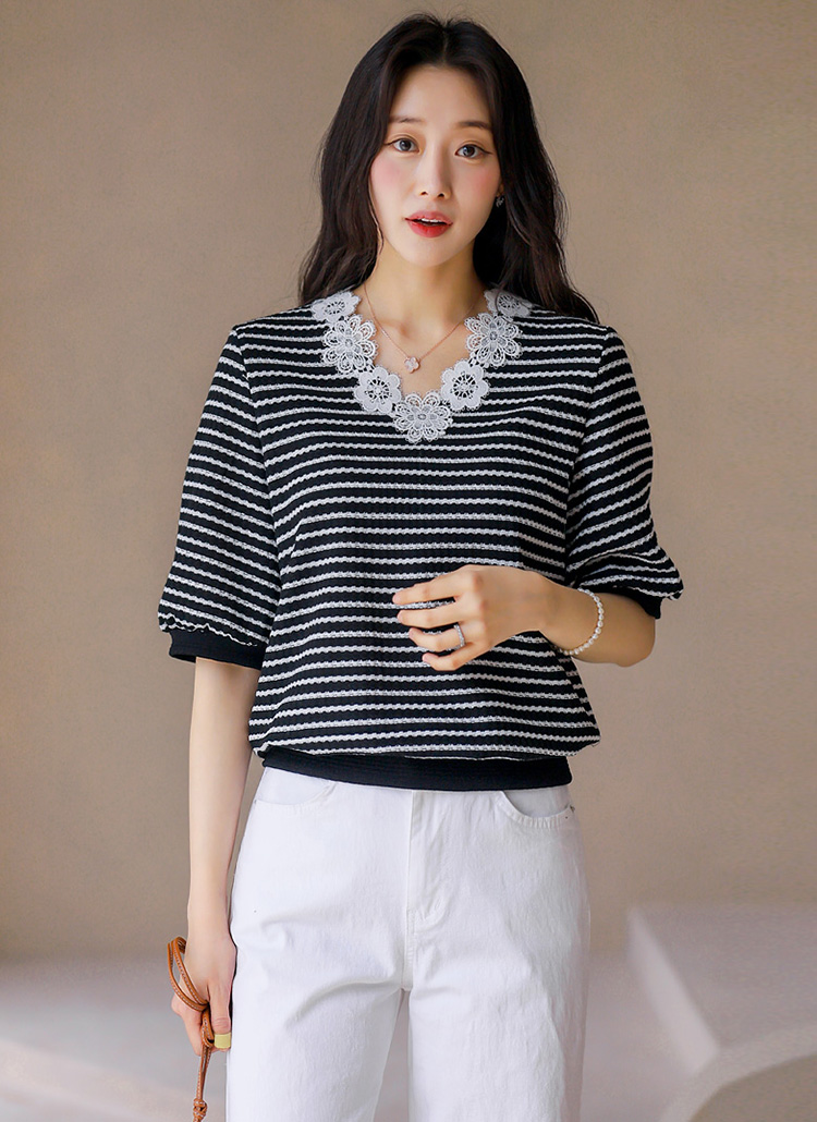 [LouisAngel] 모티브 플라워 레이스 배색 쟈가드 스트라이프 블라우스 티