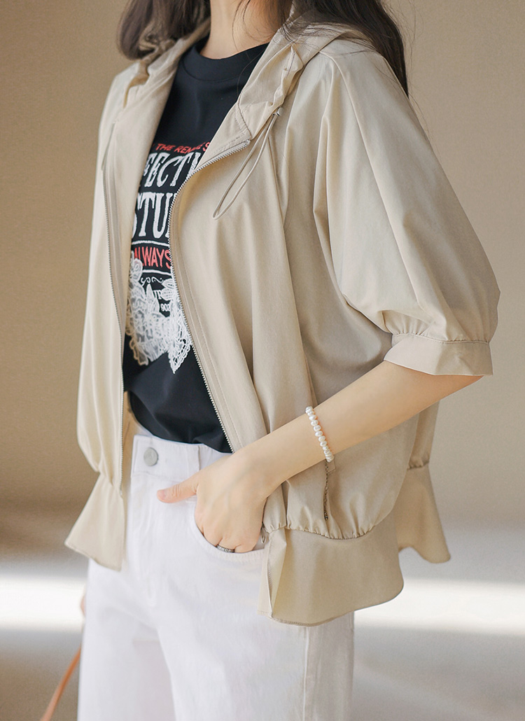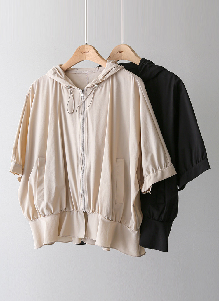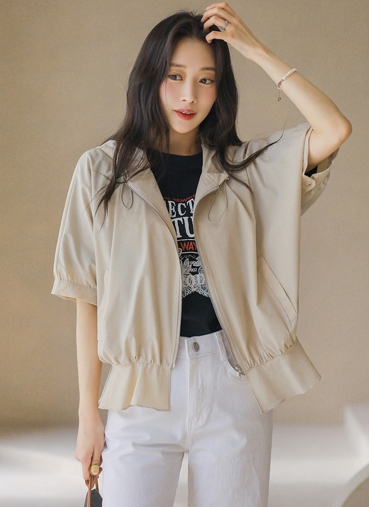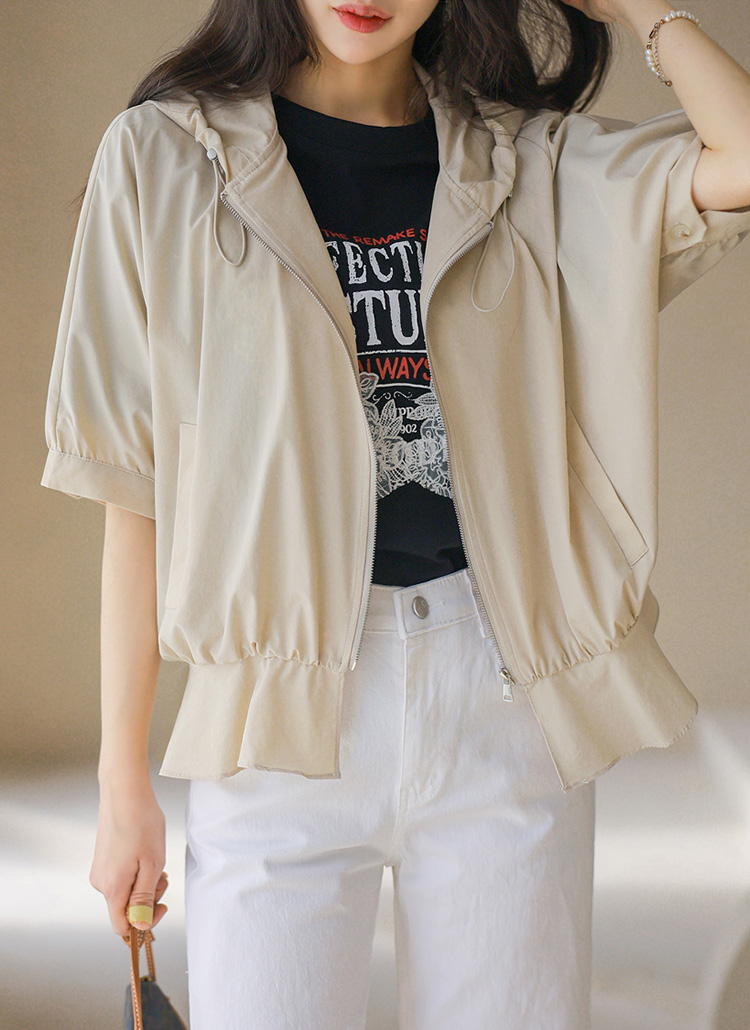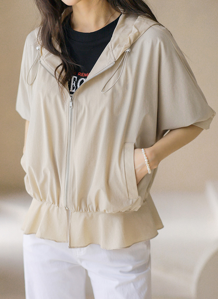 밑단 셔링 페플럼 라인 집업 후드 반팔 바람막이 점퍼
