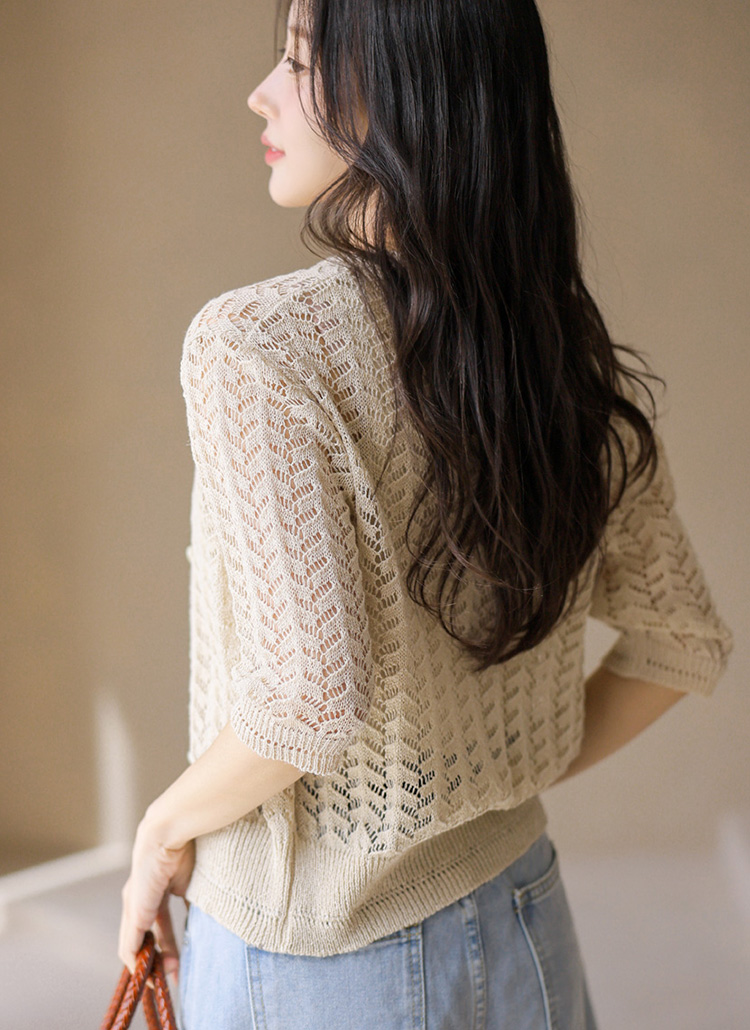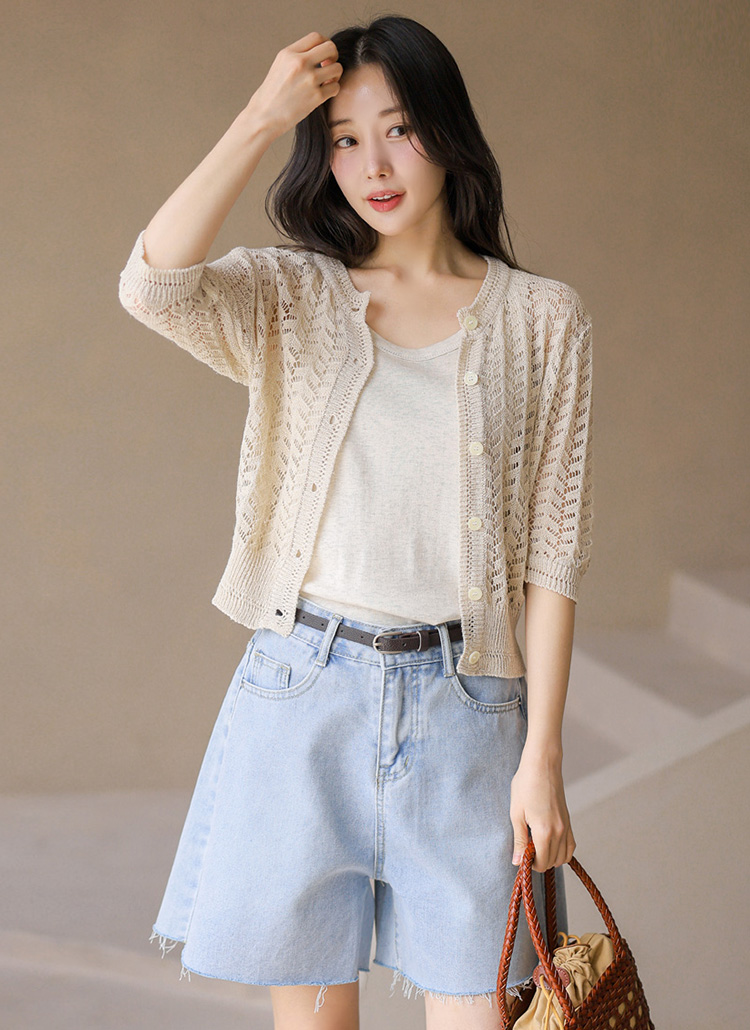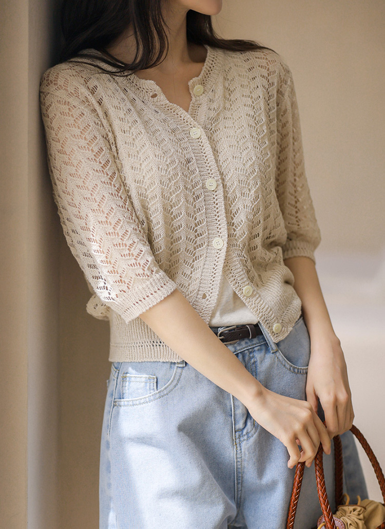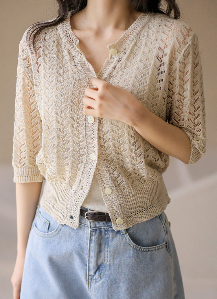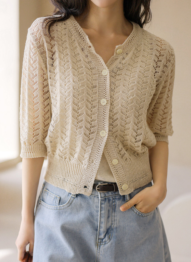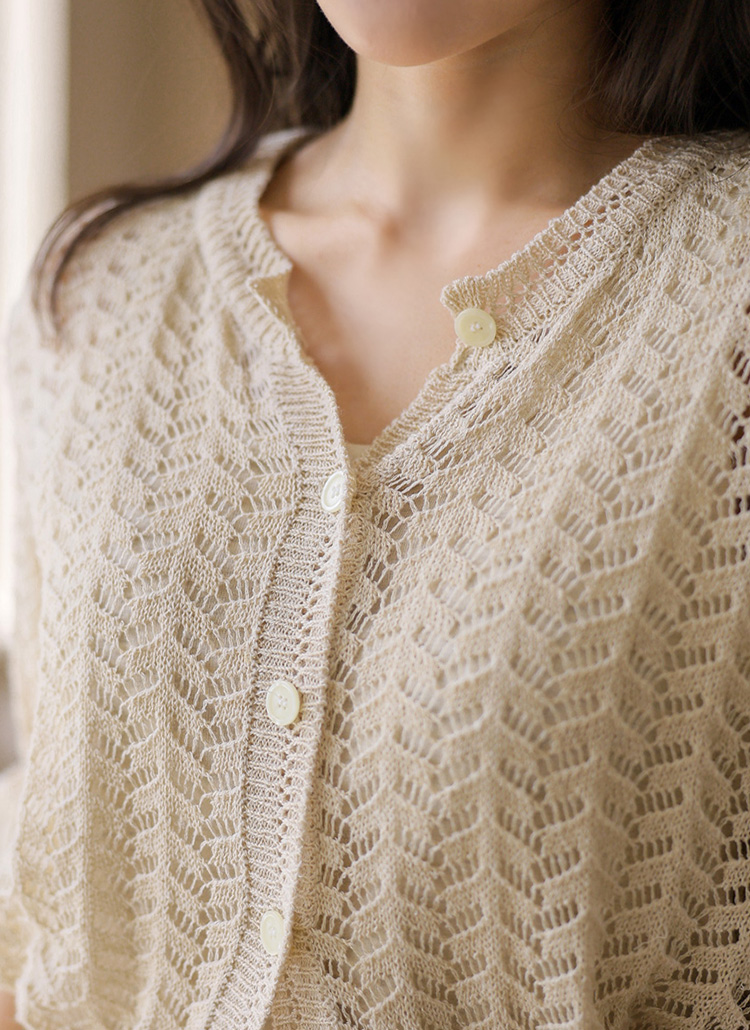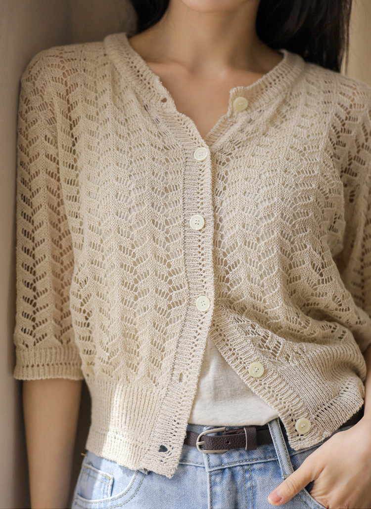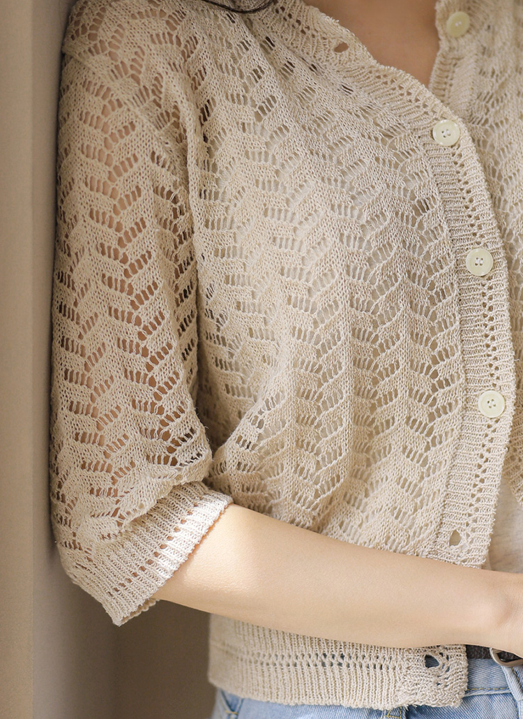 [Theonme] 린넨 스카시 물결 7부 니트 가디건